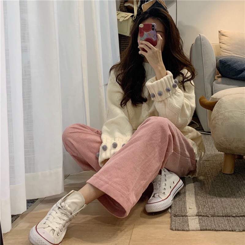 Quần nhung gân lưng cúc ống rộng cá tính ( kèm ảnh thật )